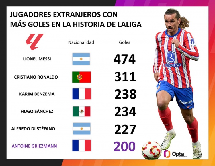足球比分网11月2日讯 马竞3-0击败塞维利亚,本场比赛格列兹曼打进1球,也完成了个人西甲赛场200球里程碑。 格列兹曼是西甲历史第11位200球先生,同时也是第6位达此成就的外籍球员。 西甲历史外籍球员射手榜: 1-梅西 474 2-C罗 311 3-本泽马 238 4-乌戈-桑切斯 234 5-迪斯蒂法诺 227 6-格列兹曼 200