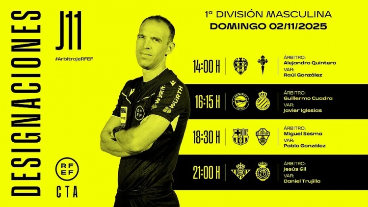 足球比分网11月1日讯 西甲第11轮本周末全面开战,西班牙足协官方公布了本轮比赛部分场次裁判安排,其中,塞斯马执法巴萨主场迎战埃尔切的比赛。 西甲第11轮部分场次裁判安排: 莱万特VS塞尔塔 主裁判:昆特罗,VAR裁判:劳尔-冈萨雷斯; 阿拉维斯VS西班牙人 主裁判:夸德拉,VAR裁判:哈维尔-伊格莱西亚斯; 巴塞罗那VS埃尔切 主裁判:塞斯马,VAR裁判:巴勃罗-冈萨雷斯; 贝蒂斯VS马洛卡 主裁判:赫苏斯-吉尔,VAR裁判:特鲁伊略。 西甲第11轮部分裁判安排:特鲁伊略主裁皇马主场对阵瓦伦西亚 |