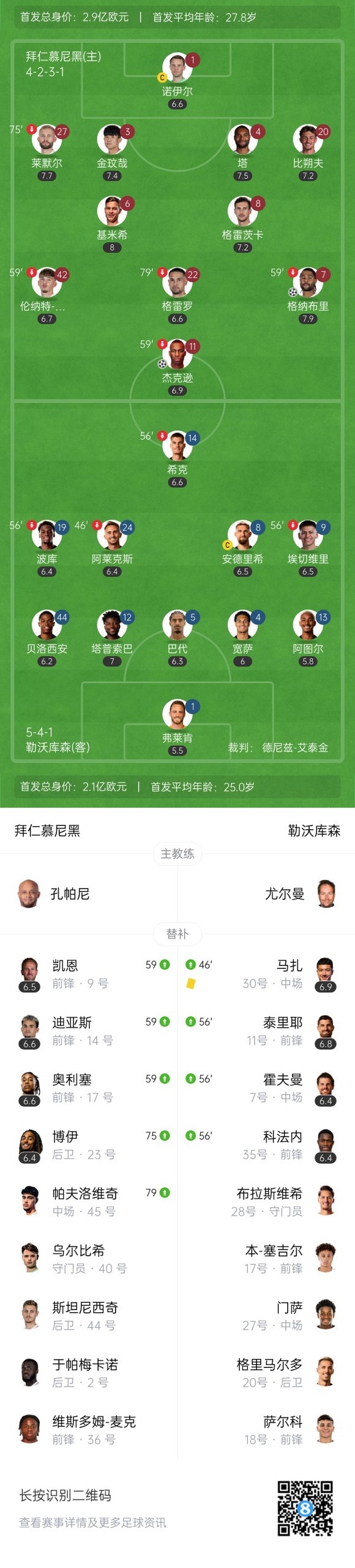 足球比分网11月2日讯 本轮德甲,拜仁3-0大胜勒沃库森,拜仁在轮换了凯恩、迪亚斯、等多名主力的情况下仍然轻松拿下比赛,甚至半场就已经三球领先。 在本场之前,药厂状态也不差,球队本已经在联赛4连胜。 此役过后,拜仁开季各赛事场次已经来到15场,继续刷新纪录,同时在新赛季联赛也已经9连胜。