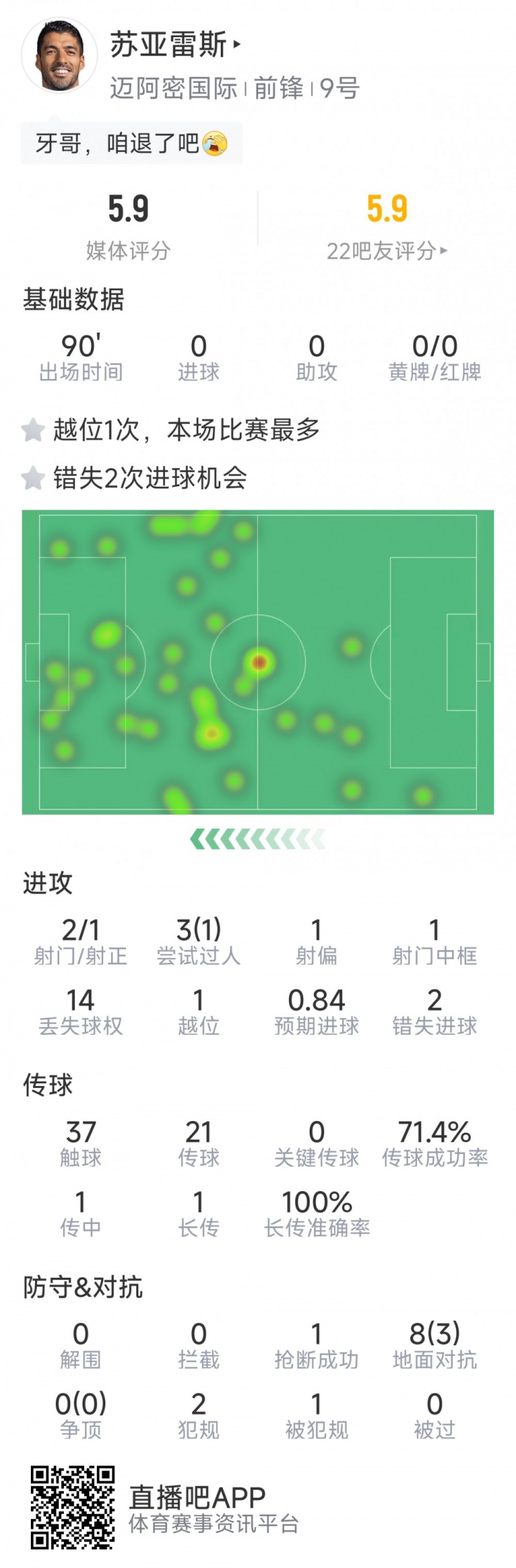 苏亚雷斯本场数据:2次错失良机,1次中柱,评分