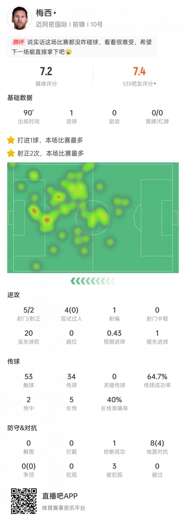 梅西数据:射门5次打进1球,4次过人0成功+20次丢