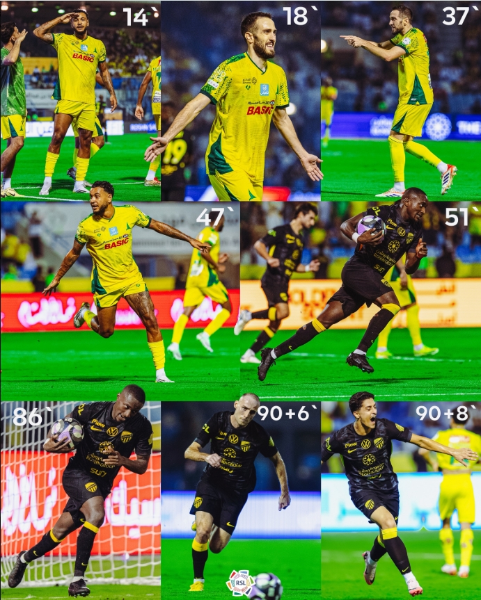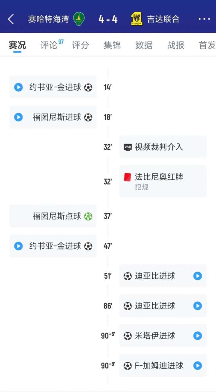 足球比分网11月02日讯 沙特联第7轮,卫冕冠军吉达联合4-4客平赛哈特海湾。 本场比赛的进程极为离谱,吉达联合第32分钟便少打一人,前利物浦中场法比尼奥染红。这时吉达联合0-2落后,下半场第47分钟时球队更是0-4落后,这场比赛成了一边倒。但是第51分钟开始,戏剧开演…… 前英超名将迪亚比第51分钟为吉达联合吹起反击的号角,10人应战的吉达联合在第86分钟、90+6分钟,90+8分钟连进3球,将比分打平成4-4,完成了惊天的绝平。 绝平进球: