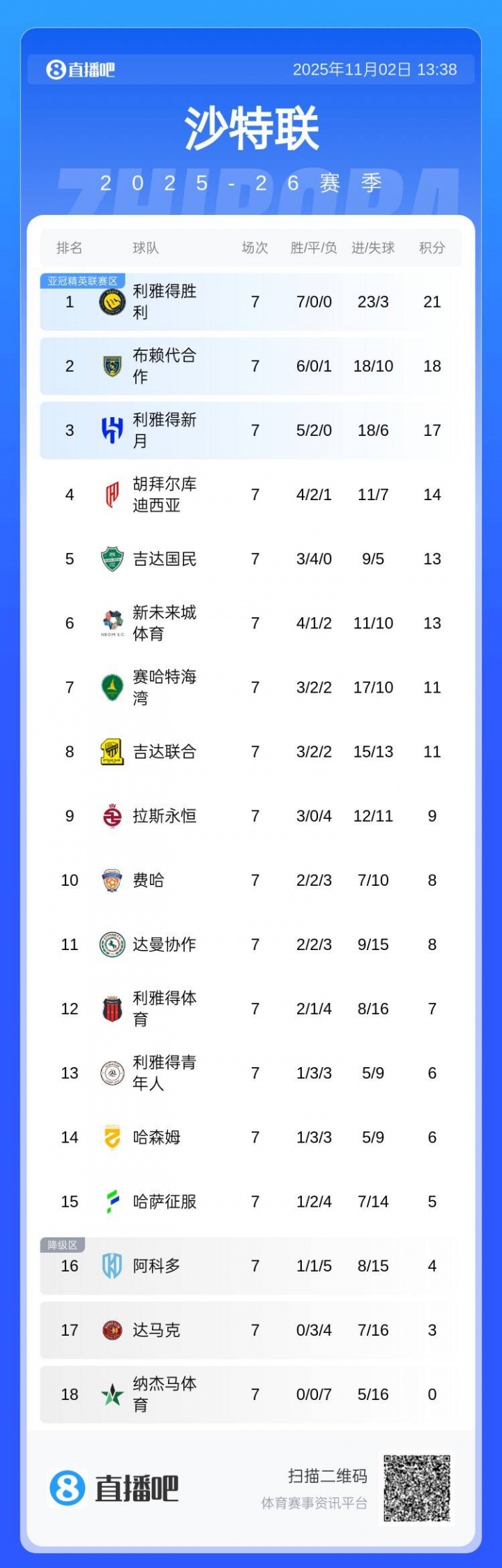 此役过后卫冕冠军吉达联合排名沙特联第8,本赛季他们的发挥很一般,上赛季的大腿本泽马缺席多场比赛。