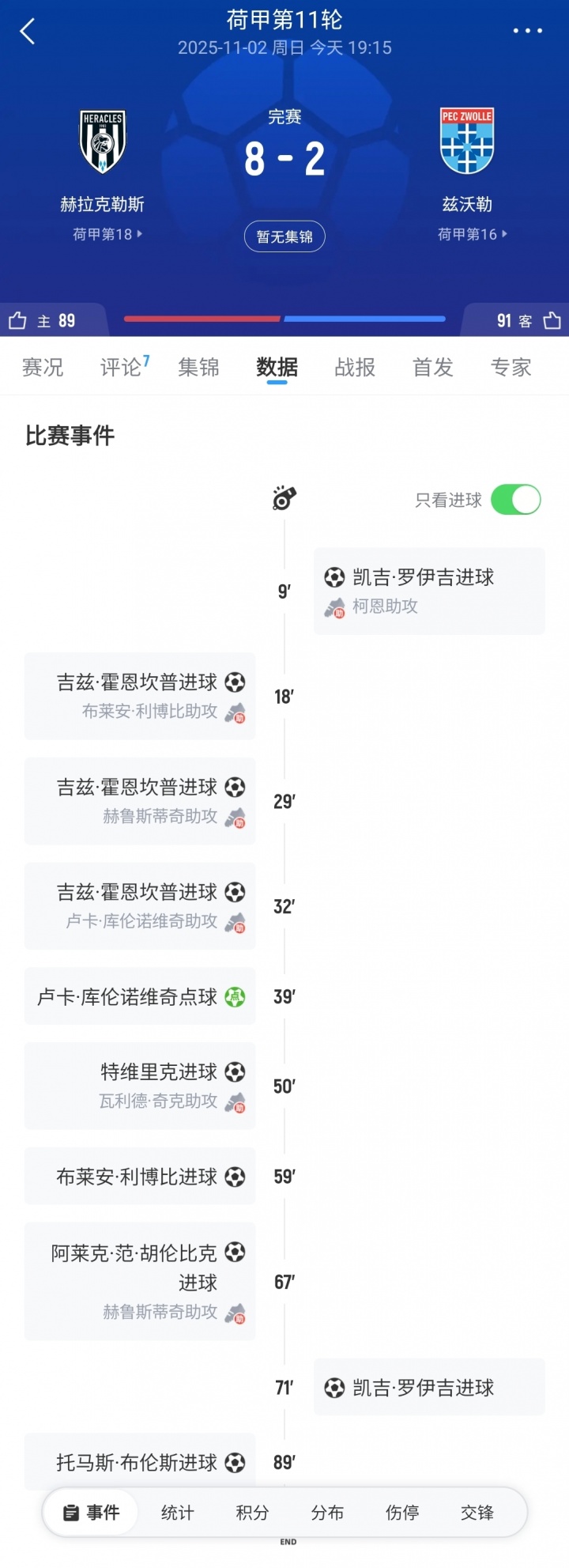 足球比分网11月02日讯 在刚结束的荷甲第11轮中,垫底队赫拉克勒斯8-2狂胜兹沃勒,本场比赛兹沃勒在第38分钟便被罚下1人,最终苦吞惨败。 不过赫拉克勒斯在取得这场胜利后仍然以6分垫底,在此之前的10轮比赛中,他们仅打进7球,丢掉30球,是联赛中进攻和防守最差的球队。