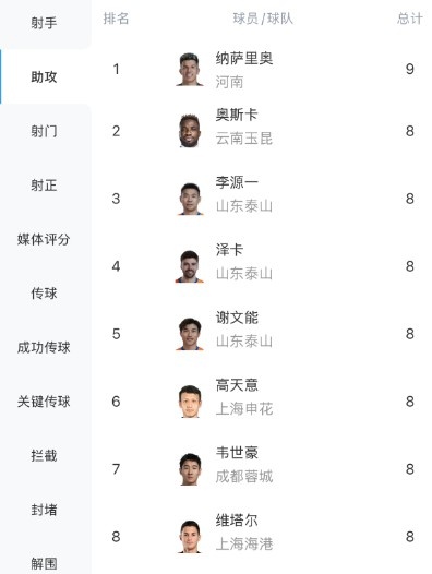 中超助攻榜:纳萨里奥9次领跑,奥斯卡、泽卡、
