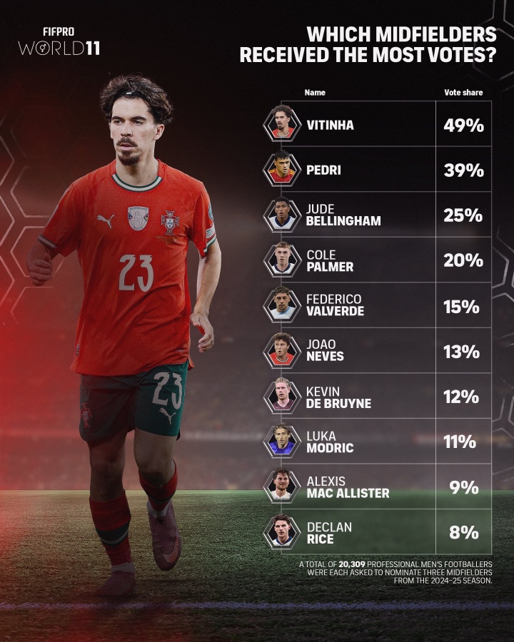 足球比分网11月05日讯 FIFPRO(国际足球运动员协会)官方公布了男足年度最佳11人中的中场位置投票细节。 投票细节及排名: 1、维蒂尼亚 49%得票 2、佩德里 39%得票 3、贝林厄姆 25%得票 4、帕尔默 20%得票 5、巴尔韦德 15%得票 6、若奥-内维斯 13%得票 7、德布劳内 12%得票 8、莫德里奇 11%得票 9、麦卡利斯特 9%得票 10、赖斯 8%得票 最终维蒂尼亚、佩德里、贝林厄姆、帕尔默四人入选男足年度最佳11人阵容(帕尔默作为票数最高的非门将球员入选),麦卡利斯特和赖斯则落选最终26人候选名单。