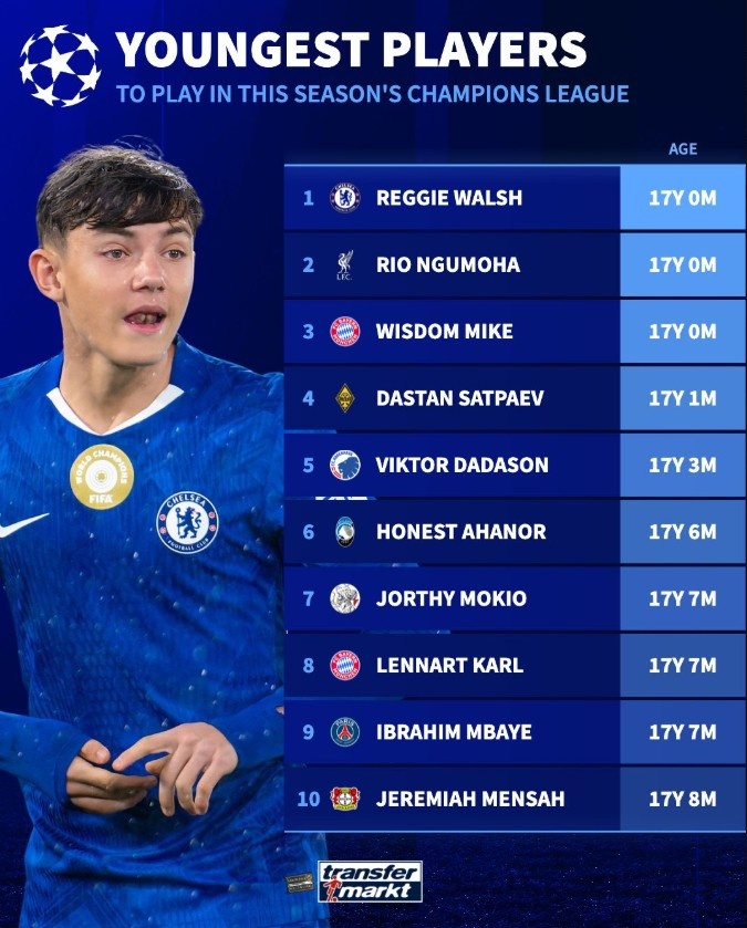 本赛季欧冠赛场最年轻球员排行:恩古莫哈、伦