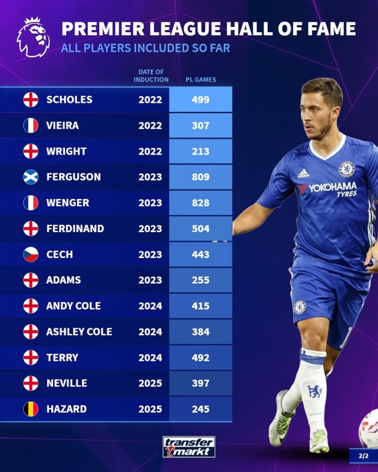 2023届: 弗格森,809场 温格,828场 费迪南德,504场 切赫,443场 亚当斯,255场 安迪-科尔,415场 阿什利-科尔,384场 特里,492场 2025届: 内维尔,397场 阿扎尔,245场