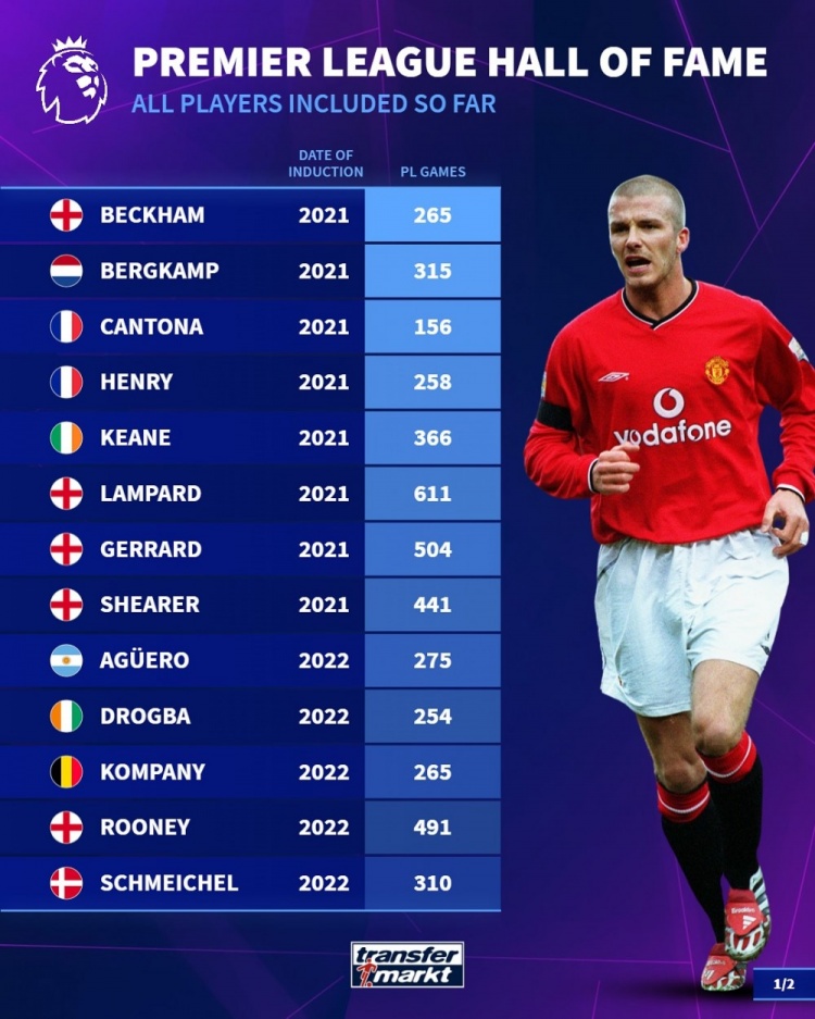 足球比分网11月4日讯 德转盘点了英超联赛名人堂成员的英超比赛参与次数,具体如下: 2021届: 贝克汉姆,265场 博格坎普,315场 坎通纳,156场 亨利,258场 基恩,366场 兰帕德,611场 杰拉德,504场 希勒,441场 2022届: 阿圭罗,275场 德罗巴,254场 孔帕尼,265场 鲁尼,491场 舒梅切尔,310场 斯科尔斯,499场 维埃拉,307场 伊恩-赖特,213场