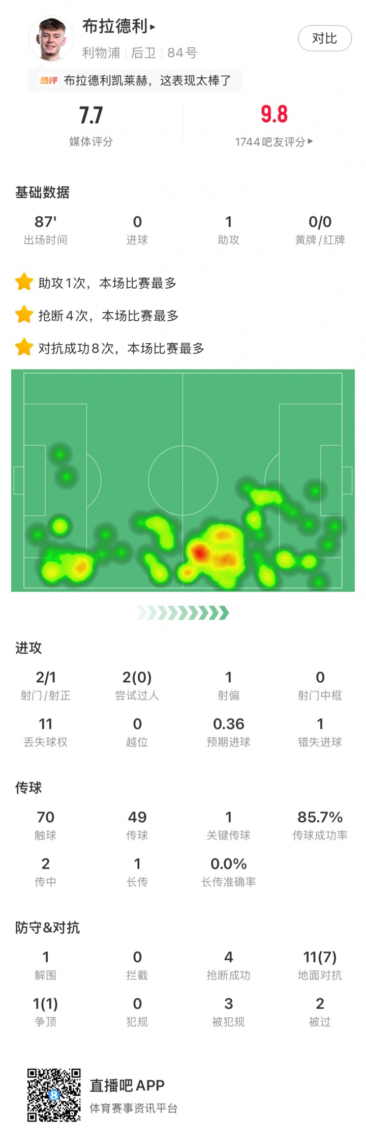 足球比分网11月05日讯 欧冠联赛阶段第4轮,利物浦1-0皇马。 本场比赛利物浦右后卫布拉德利发挥出色踢满全场,4次过人3次成功,贡献2次解围、1次拦截、3次抢断,造了维尼修斯黄牌。布拉德利也当选利物浦队内本场最佳。 而在近1年之前,去年的欧冠联赛阶段第5轮,利物浦2-0皇马。在这场比赛中布拉德利也发挥出色,当时布拉德利送出1次助攻,4次抢断,对抗成功8次,评分7.7分。