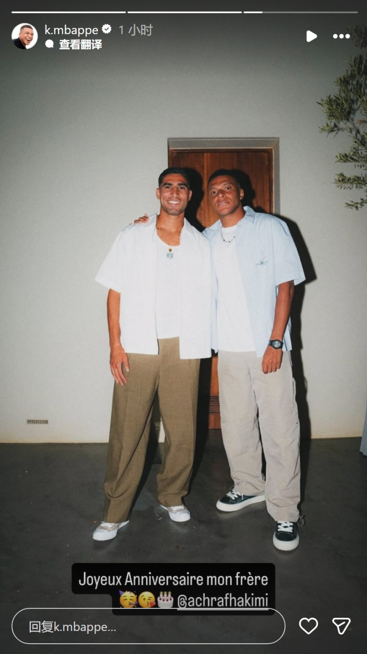 足球比分网11月4日讯 姆巴佩更新社媒动态,为好友阿什拉夫庆生。 巴黎边卫阿什拉夫迎来27岁生日,姆巴佩社媒晒出与阿什拉夫的合照,配文:“生日快乐,我的兄弟。” 姆巴佩曾在巴黎与阿什拉夫共事,两人建立了深厚友谊。