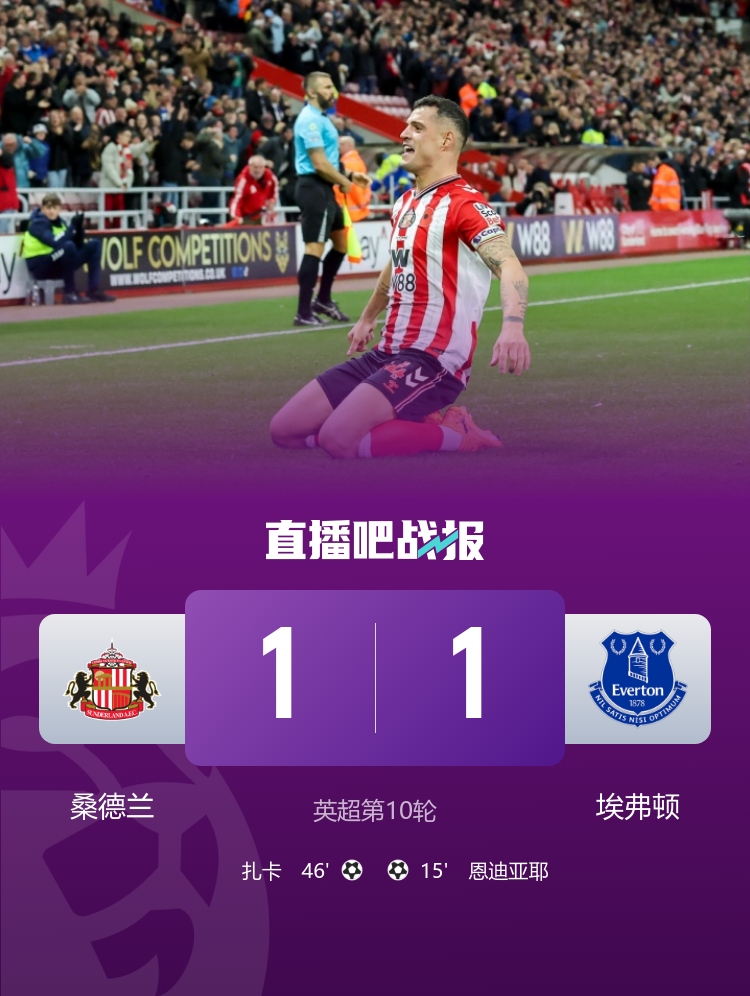 恩迪亚耶破门首开记录,扎卡抽射破门扳平比分,基恩禁区手球未判罚,最终桑德兰1-1埃弗顿升第4。 手臂张开不是点球?英超官方:VAR检查认为基恩手臂处于合理位置