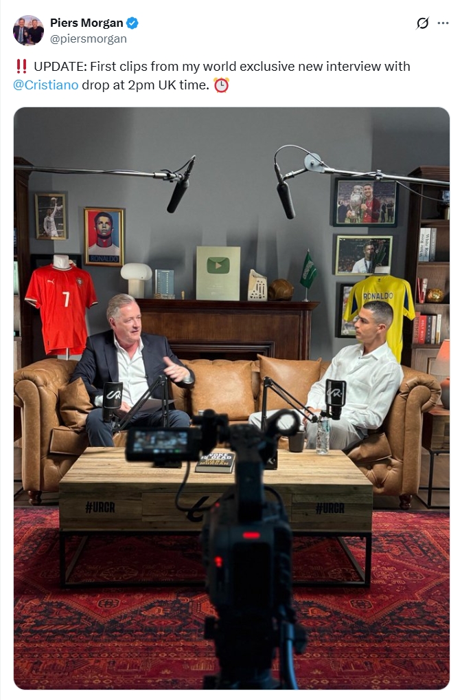 足球比分网11月03日讯 著名主持人皮尔斯摩根发文预热表示,C罗全球独家专访的首个片段将于北京时间今晚10点放出。 摩根上周曾透露,C罗第二次接受了他的全球独家专访,并且表示这是他“一生中最私密、最坦诚的采访”。 【相关】 爆了!时隔3年来袭!摩根:下周推出!C罗一生最私密、坦诚的采访 摩根:C罗80分钟专访将有超多猛料!包含许多私人话题,不容错过