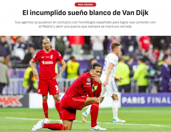 阿斯:范戴克今夏曾极力争取转会皇马,但皇马