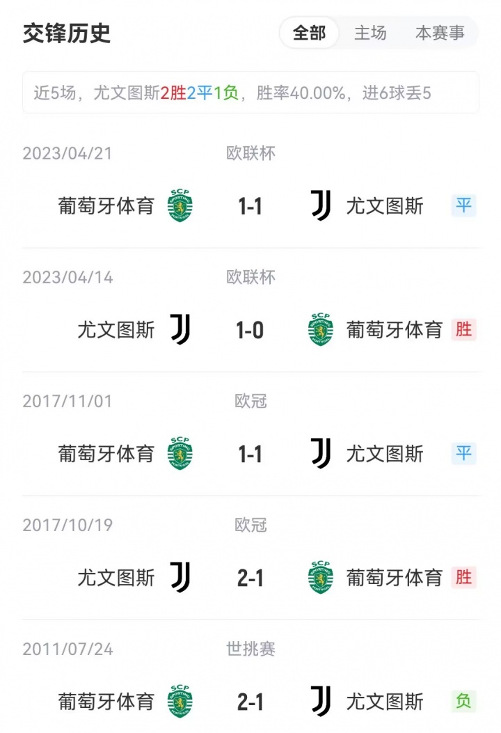 本场比赛前尤文在欧冠遭遇3轮不胜,仅积2分排名第25;葡萄牙体育3轮2胜1负,积6分排名第12。双方上次交手要追溯到2023年的欧联杯,尤文客场1-1战平葡体,总比分2-1淘汰对手。 【交锋历史】