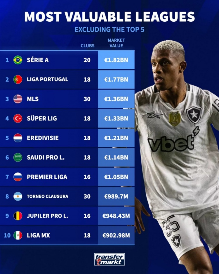 五大联赛之外联赛身价排名:巴甲18.2亿欧居首,