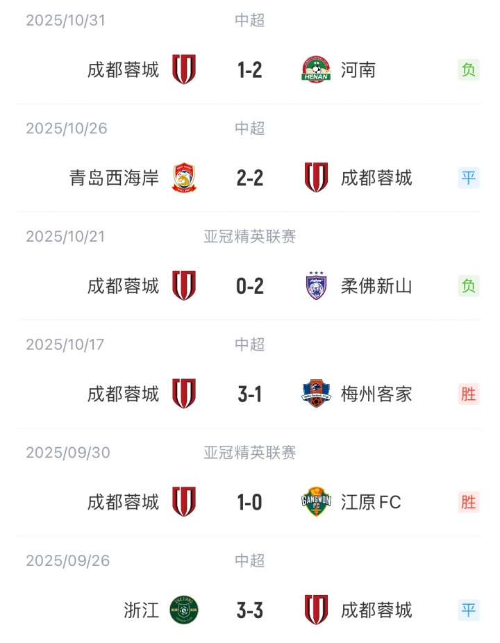 本轮赛前,成都蓉城1胜0平2负积3分排名东亚区第9,处于晋级区外;首尔FC则是1胜1平1负积4分位列第6。蓉城近期各项赛事3轮不胜。 【蓉城近期战绩】