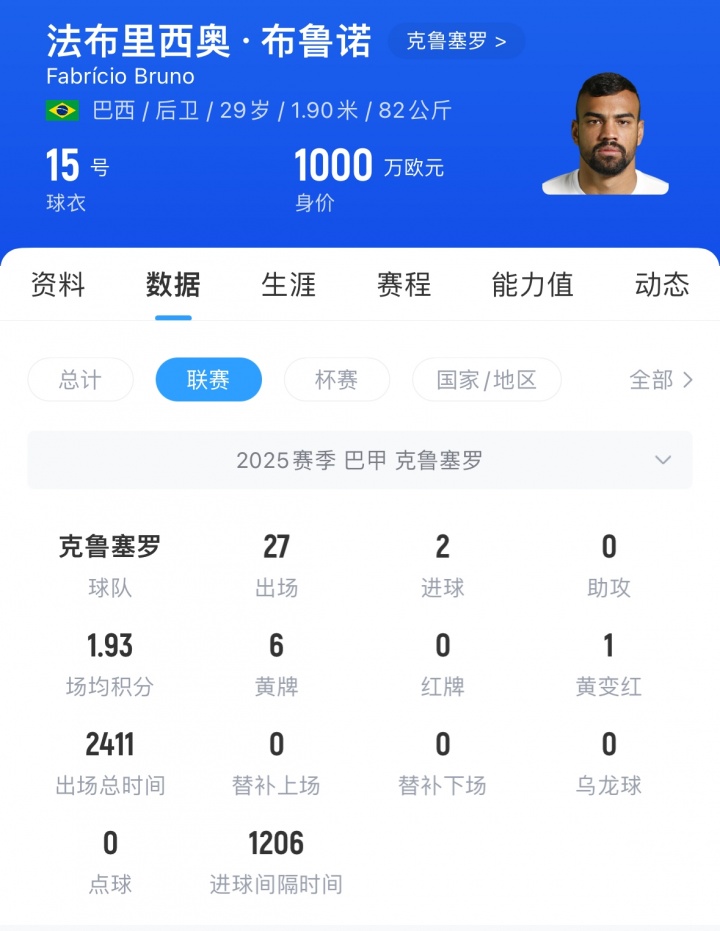 足球比分网11月04日讯 北京时间今天凌晨,安切洛蒂公布了巴西队本期名单,在上一次国际比赛日中表现糟糕的克鲁塞罗中卫布鲁诺继续入选大名单。 在上个月的国际友谊赛中,日本队主场连入三球3-2逆转巴西队。布鲁诺上演灾难级别表现,先是腿软送对手单刀,此后又解围时不慎爆射自家球门,直接帮助日本队完成让二追三。 赛后,他在接受媒体采访时哭红眼眶并向球迷道歉,同时也表示不认为这场比赛的失误会影响自己入选大名单。 附本期巴西队入选后卫:阿莱士·桑德罗(弗拉门戈)、卡约·恩里克(摩纳哥)、达尼洛(弗拉门戈)、埃德尔·米利唐(皇马)、法布里西奥·布鲁诺(克鲁塞罗)、加布里埃尔·马加良斯(阿森纳)、卢西亚诺·朱巴(巴伊亚)、马尔基尼奥斯(巴黎圣日耳曼)、保罗·恩里克(瓦斯科达伽马)、韦斯利(罗马) 布鲁诺腿软将球传给对手送单刀↓ 布鲁诺解围时将球打入自家球门↓ 布鲁诺现年29岁,他本赛季至今为克鲁塞罗出场27次,打进2球,在上一轮球队0-0战平帕尔梅拉斯的比赛中,布鲁诺第71分钟两黄变一红被罚下。