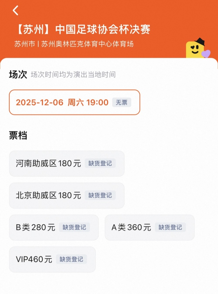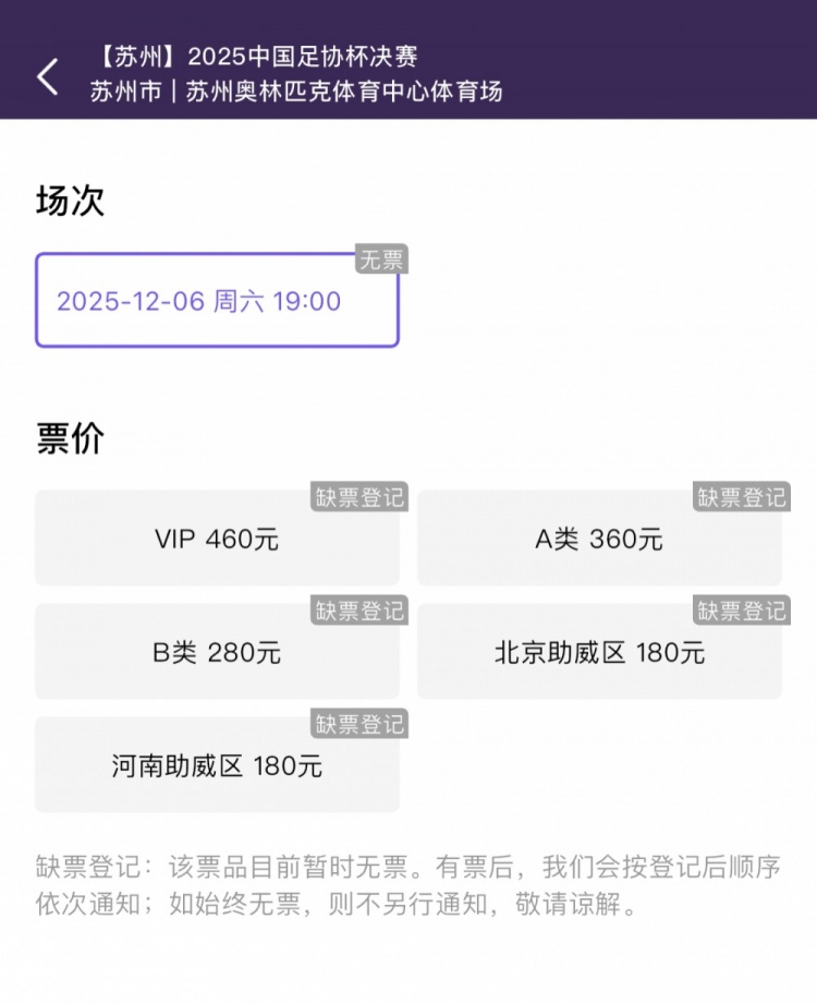 足球比分网11月6日讯 北京时间12月6日晚上19:00,中国足协杯决赛将在苏州奥体中心体育场打响,北京国安对阵河南队。 本场决赛的球票于今天(11月6日)10:58在多个平台同时发售,销售火爆,开售即售罄。 足协杯决赛票价100元-460元不等,两队专业球迷票价100元,两队助威区180元,B类280元,A类360元,VIP460元。