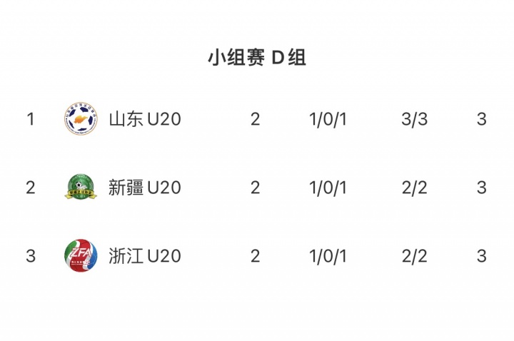 浙江所在的D组出现了极为罕见的情况,山东队、浙江队、新疆队积分均为3分,且净胜球均为0球。山东队凭借总进球数多(进3球)的微弱优势获得小组第一。浙江队和新疆队总进球数均为2球,红黄牌数量也完全一致,或将通过抽签决定八强最后一席出线权。