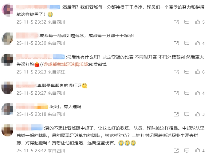 中国足协昨日22:37公布评议,蓉城1-2河南比赛中有两次错判。 完整评议戳→艾堃2次错判!足协评议:蓉城进球被吹判罚错误+漏判蓉城点球 随后成都蓉城官博在23:14转发足协微博,球迷们在评论区非常不满。 部分球迷评论如下: