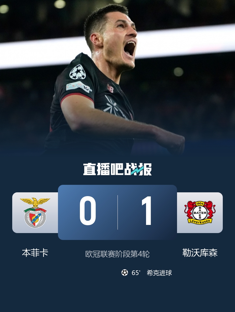 希克破门,本菲卡0-1不敌勒沃库森,遭遇欧冠4连败。 欧冠-纽卡2-0毕巴 丹伯恩、乔林顿头槌破门特里皮尔定位球助攻 队史欧冠首胜!帕福斯1-0黄潜 卢卡森头球破门黄潜欧冠4轮不胜 绝杀!亚特兰大1-0马赛 萨马尔季奇世界波绝杀德凯特拉雷失点 欧冠四连败!阿贾克斯0-3加拉塔萨雷 奥斯梅恩戴帽萨内献助攻 【比赛声音/数据】 ⚔️欧冠第4轮积分:拜仁枪手国米全胜领跑!本菲卡贾府全败垫底