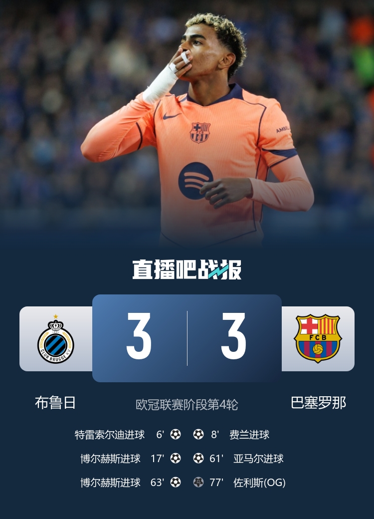 【战报新闻】 3度落后又扳平!巴萨3-3客平布鲁日 费尔明2助攻亚马尔独造2球