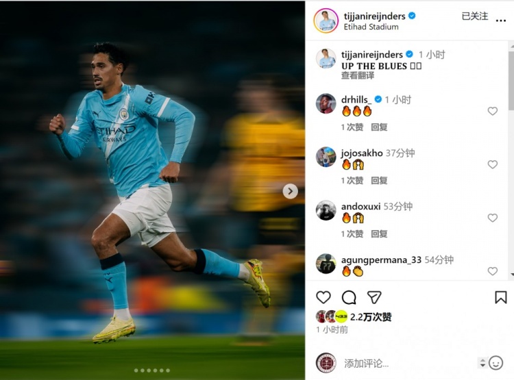 助攻双响!赖因德斯社媒庆祝胜利:加油蓝月