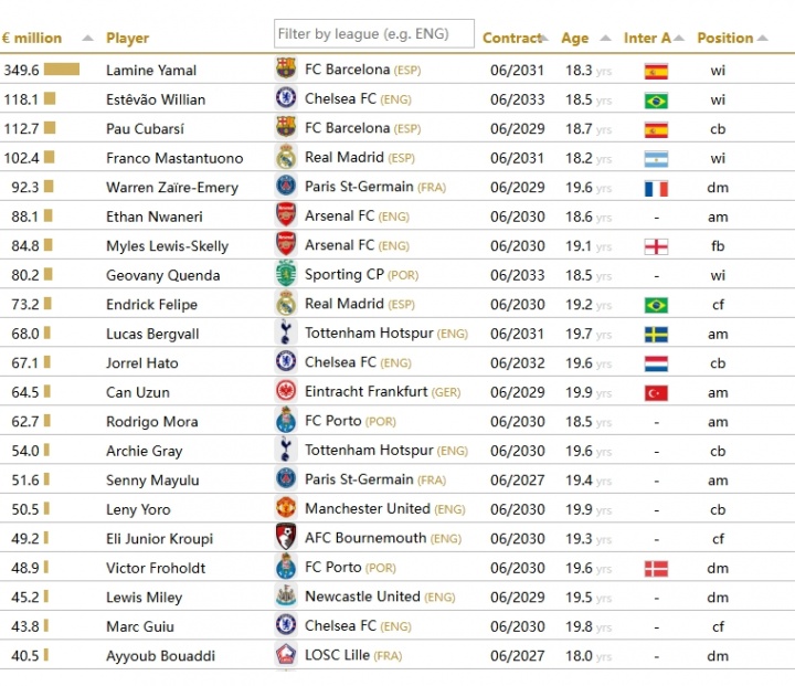 足球比分网11月05日讯 今日,足球权威统计机构CIES统计了尚未年满20岁但预估转会费最高的球员,其中四位球员的预估转会费超过1亿欧元(含附加条款,且为100%所有权)。亚马尔3.5亿欧,断层领先! 据CIES统计,未年满20岁,预估转会费最高的球员排名为:1亚马尔(3.5亿欧元)2埃斯特旺(1.18亿欧元)3库巴西(1.13亿欧元)4马斯坦托诺(1.02亿欧元)。 据估计,全球共有113名青少年球员身价至少达到1000万欧元,他们效力于25个联赛和80家俱乐部。 其中,英超联赛球员人数最多(23人),其次是德甲联赛(16人)和法甲联赛(11人)。 以下为CIES未满20岁预估转会费top10 1、亚马尔(巴萨):3.5亿欧元 2、埃斯特旺(切尔西):1.18亿欧元 3、库巴西(巴萨):1.13亿欧元 4、马斯坦托诺(皇马):1.02亿欧元 5、埃梅里(巴黎圣日耳曼):9200万欧 6、恩瓦内里(阿森纳):8800万欧 7、斯凯利(阿森纳)8400万欧 8、昆达(葡萄牙):8000万欧 9、恩德里克(皇家马德里):7300万欧 10、贝里瓦尔(托特纳姆热刺):6800万欧