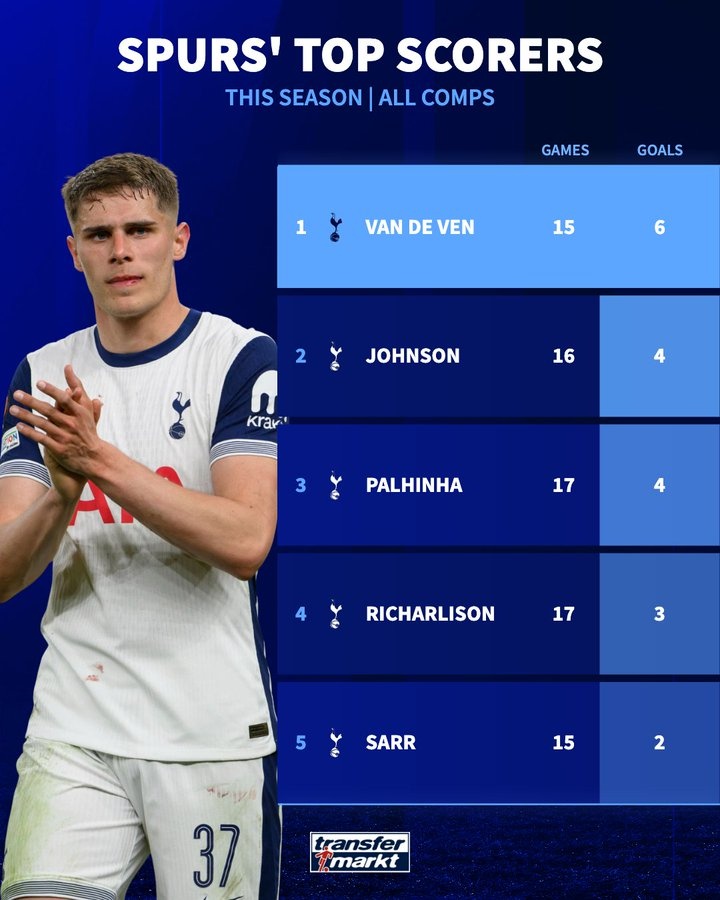 足球比分网11月5日讯 欧冠联赛阶段第四轮比赛,约翰逊、奥多贝尔、范德芬、帕利尼亚破门,热刺主场4-0击败哥本哈根。 德国转会市场统计了本赛季热刺队内球员的进球数量,并列出榜单,中卫范德芬6球居首。 本赛季热刺队内射手榜: 范德芬——15场6球 约翰逊——16场4球 帕利尼亚——17场4球 里沙利松——17场3球 萨尔——15场2球 |