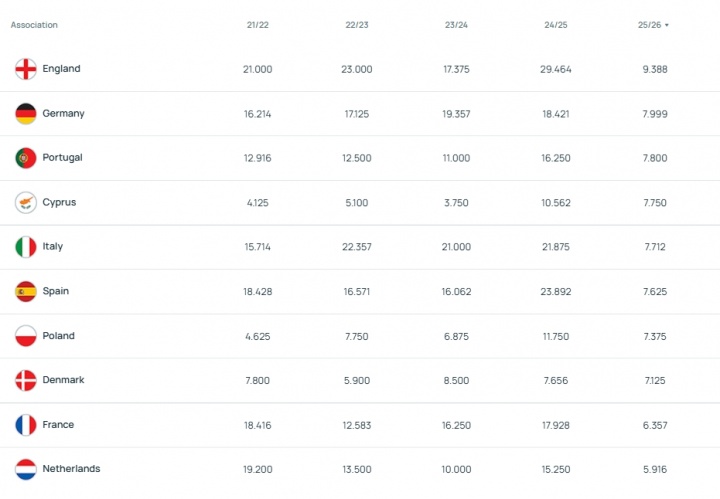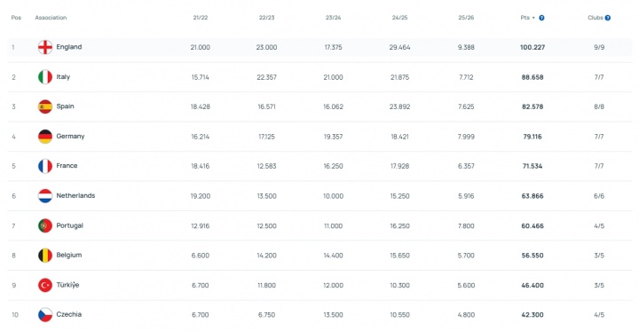 欧战本赛季最新积分:英格兰、德国、葡萄牙前