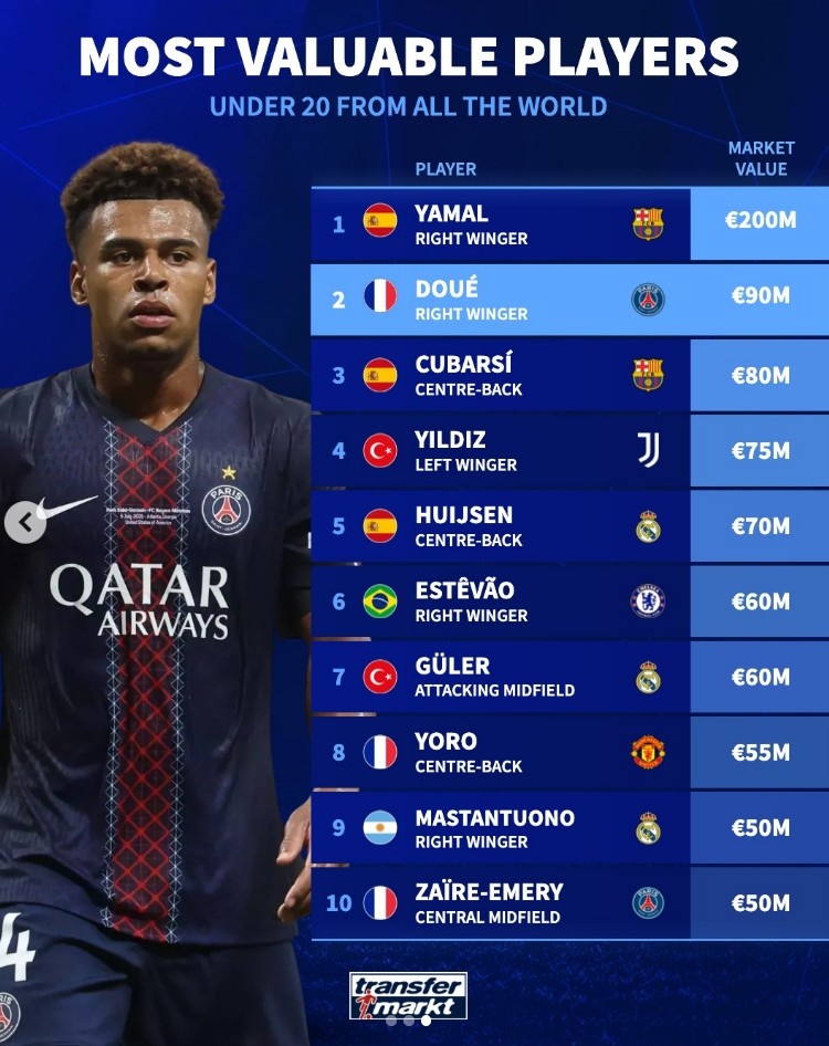 足坛U20球员身价榜:亚马尔2亿欧居首,杜埃次席