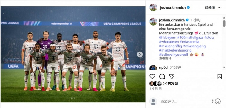 足球比分网11月5日讯 在本轮欧冠,拜仁2-1击败巴黎。 本场比赛也是基米希生涯第100次在欧冠出场,他在个人社媒晒出全队合照,配文写道:“在这一场紧张激烈的比赛中,球队表现完美,达成欧冠百场里程碑!” |