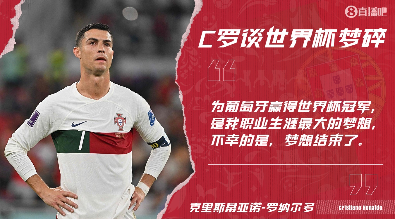 2022年12月11日,世界杯1/4决赛,葡萄牙0-1不敌摩洛哥,无缘世界杯4强。 C罗发文:“为葡萄牙赢得世界杯冠军是我职业生涯中最大、最雄心勃勃的梦想。幸运的是,我也赢得了很多国际级别的冠军,包括为葡萄牙赢得的冠军,但让我们国家的名字登上世界顶点是我最大的梦想。 我一直为此而战!为了这个梦想,我努力奋斗!过去16年,我连续参加了5届世界杯并且取得进球,总是和伟大的球员们并肩作战,并得到了数百万葡萄牙人的支持,我也付出了自己的全部。我把一切都留在了球场上,面对战斗我从不逃避退缩,我也从未放弃那个梦想。 不幸的是,昨天梦想结束了。外界说了很多,写了很多,猜了很多,这些不值得太多的激烈回应,但我只想让每个人知道,我对葡萄牙的奉献从未改变。我永远是一个为所有人的梦想而战的人,永远不会背弃我的队友和国家。 最后,没有太多要说的了。谢谢你,葡萄牙。谢谢你,卡塔尔。追逐梦想总是美好的……如今,希望时间能成为好的导师,去让每个人都能得到自己的结果。”