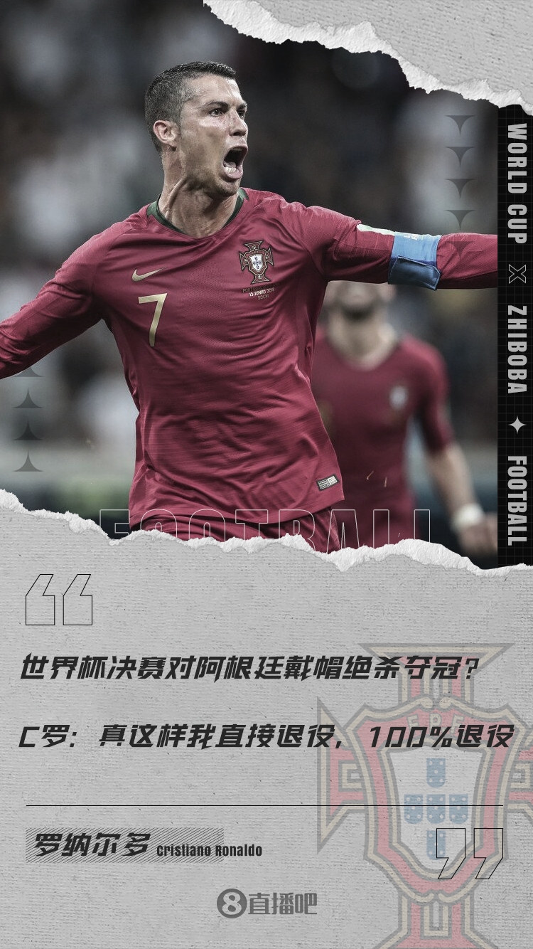 2022年世界杯前,11月17日C罗在接受Livescore记者采访时说道:“坦白讲,争夺世界杯是最困难的,但我仍然心怀这一梦想。我清楚这非常困难,但梦想是无拘无束的,我一直都怀着这一梦想。在我看来,这届世界杯可能是有史以来最棒的一届。” 2022年11月18日,摩根专访C罗视频发布。 摩根:如果赢得世界杯,这会是你生涯的一个巅峰吗? C罗:说实话,我梦想过一次。 摩根:拿着世界杯奖杯。 C罗:这会很难,非常难。一切都有可能,我们当然会去争夺。 之后C罗还表示若世界杯决赛对阵阿根廷戴帽夺冠,100%退役。 摩根:你看这样如何。你进了决赛,葡萄牙对阿根廷,你进了两个,梅西进了两个,第94分钟你绝杀完成帽子戏法,赢得世界杯。这样子,老实说,是你梦想的吗? C罗:这也太好了,我没想过好到这样的梦(笑)。你可以说其他人进球,我不在乎,如果是葡萄牙进世界杯决赛,哪怕是门将进球,我也是世界上最开心的人。 但是,如果你刚说的情况真的发生了,那我可以说我会退役(笑)。 摩根:就退役了? C罗:退役,100%退役。
