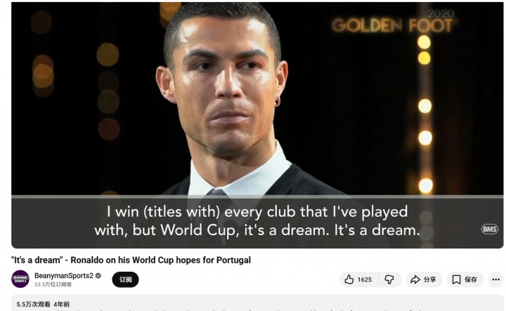 足球比分网11月05日讯 北京时间11月4日在摩根与C罗专访第二部分预告中,40岁C罗表示世界杯不是自己的梦想。 不过,C罗近年来多次采访都表示一直都怀着为葡萄牙国家队赢得世界杯的梦想。 近年来部分C罗采访: 早在2020年12月31日,C罗接受BeanymanSports采访表示:就像我说过的,我想为葡萄牙赢得冠军锦标,之前我们已经赢过两个了,但世界杯,那仍是我的梦想。
