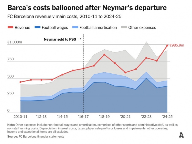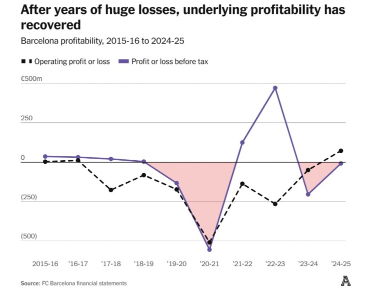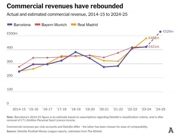 诺坎普计划债务由2023年设立的证券化基金持有,专为项目融资。简言之,该基金主要通过发债募集资金,再转贷给巴萨用于建设。回报则是未来通过翻新后诺坎普的额外收入偿还贷款。 该基金原被视为受巴萨控制,故其资产与负债纳入合并报表。但基金活动不仅限于向俱乐部输血。成立初期,它募集了超10亿欧元债务,远超出巴萨当时所需。 因此,上赛季债务数字包含了证券化基金的全部借款,无论是否已转贷给俱乐部。 此番,新审计师认定巴萨实际不控制该基金,其资产与负债不应纳入合并报表。故仅计入巴萨欠基金的债务。由于此金额低于基金总借款,债务数字较23/24财年下降。 现实中,巴萨债务仍在攀升。随着诺坎普计划成本持续增长至完工,基金债务总额预计将重现于俱乐部账本。 巴萨财务问题不仅困扰西班牙监管机构。连续两个赛季,他们以不同方式触犯了欧足联规定。 22/23赛季,他们因收入分类错误受罚,试图将首笔2.67亿欧元转播权出售收益计入盈亏平衡考核。巴萨对此决定及50万欧元罚款提起上诉,但CAS仲裁小组支持欧足联,认为罚金“实际偏轻”。 即使剔除这2.67亿欧元交易,巴萨当季仍勉强满足盈亏平衡要求,部分归因于疫情相关调整。但一年后情况有变,欧足联对杠杆操作较西甲更为严厉,巴萨在新规“足球收益”实施首年即超标。为此,他们被再罚1500万欧元,并与欧足联达成两年和解协议。 后续财务处罚可能接踵而至。若巴萨在本赛季或下赛季超出约定的足球收益目标,每年最高将被罚2250万欧元——这还仅限超标额不超过2000万欧元。若任一年度超标超2000万欧元,将被视作违反和解协议,欧战禁赛一年。 24/25赛季巴萨再录亏损,但840万欧元的金额较往年显著收窄。这包括了7160万欧元PSL收入(大概率不可重复),但抵消因素将是诺坎普重启后的持续收益——无论何时实现。 足球成本曾是巴萨痼疾,尽管上年度增至4.714亿欧元(工资加摊销),但较2019年恐怖峰值已降超1.2亿。结合重回增长轨道的营收,俱乐部八年来首次实现运营利润(7210万欧元)。工资占收入比例降至52%,为十二年来最低。 营收增长主要由商业收入大涨驱动。巴托梅乌时代虽以挥霍闻名,但商业开发成绩斐然。其执政五年间至疫情前,该收入流翻倍增长,部分得益于18/19赛季通过设立BLM将零售业务收归自营。