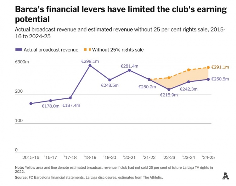 西甲球队成本上限的剧烈波动凸显了巴萨近期财务状况不稳定 疫情后既无法也不愿大幅提高会员费,同时不愿牺牲竞技实力,俱乐部最终决定变卖长期资产换取短期输血。 若听似不负责任,需指出巴萨与皇马一样,在摆脱财务困境时比多数豪门更受限。例如,皇马于2022年出售翻新后伯纳乌运营业务部分权益,换取3.6亿欧元20年收益。 会员制属性及由此导致的注资能力有限,意味着两家俱乐部必须稳健经营。而在21世纪头二十年的大部分时间里,巴萨确实如此。2003至2019年间,他们仅两个赛季亏损,期间累计净税前利润达2.288亿欧元。 当形势急转直下,疫情又雪上加霜时,巴萨的应对选项远少于巴黎(2019-2024年所有者注资达6.714亿欧元)、曼城或切尔西等俱乐部。后两家凭借昔日雄厚注资(及必要时持续输血的预期),在20/21赛季全球足球因空场运营挣扎时,仍合计豪掷4.68亿欧元引援。或许巧合,当赛季欧冠决赛正是曼城对切尔西。 巴萨本可悬崖勒马般削减球员支出,但在需与石油资本及国家财富角逐欧洲赛场的时代,他们选择优先短期收益而非长远规划,亦在情理之中。 首轮杠杆于2022年6月启动,巴萨宣布出售未来25年10%的西甲电视转播分成。买方美国投资集团第六街支付了2.671亿欧元,数周后又以4.004亿欧元购得另外15%的权益。 总计,巴萨放弃未来25年国内转播收入的25%,即刻换取6.675亿欧元现金。首笔交易计入21/22财年,次笔计入22/23财年。 现金注入帮助抵消了后一财年近2亿欧元的运营现金赤字。巴萨拥有未知成本的回购权,可在25年期限前提早赎回这些权益。但与此同时,出售意味着他们放弃了可观的年度收入。