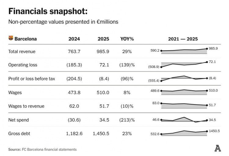 走出财务深渊,巴萨上演了一场惊心动魄的“杠杆”自救。变卖家当、透支未来,只为留住竞争力。这条荆棘之路,是孤注一掷的豪赌,更是会员制俱乐部在金元时代的艰难求存。The Athletic作者Chris Weatherspoon就讲述了这段故事。 巴萨那段低迷岁月,看起来总算翻篇了。 上赛季他们重夺西甲冠军,近三年两度捧杯,一扫本世纪初连续三年无冠的阴霾。欧冠也六年来首次闯入半决赛。尽管上周末客场不敌皇马,但巴萨此前在各项赛事中已拿下国家德比四连胜。这支球队,终于重拾竞争力。 足球世界向来如此:场上挣扎,场下必不安宁。巴萨近年来的场外大戏堪称跌宕起伏——成本与债务飙升,各种骚操作和财务手段令人眼花缭乱。甚至催生了一个足坛新词:“杠杆”。 这些杠杆构成巴萨财务图景的关键部分,即便部分操作早在数年前就已启动。它们对诺坎普的财务产生了深远影响,正如持续进行的翻修工程,让球队暂时告别了这座传奇主场。 近年想理清巴萨财务状况近乎天方夜谭,其复杂程度如同对战九头蛇——刚厘清一笔复杂交易,立刻又冒出两笔新的。这家加泰罗尼亚豪门在10月公布24/25赛季财报时,宣称实现了“全方位经济复苏与运营效率提升”。 但一如往常,豪言壮语之下,真相往往更微妙。 巴萨的处境确实比几年前改善不少。“复苏”一词用得恰如其分,而杠杆操作也确有其不得已。 但这些操作将巴萨带向何方?答案错综复杂。要回答这个问题,我们得回溯:这家曾是世界最富有的俱乐部之一,是如何跌入财务谷底的。