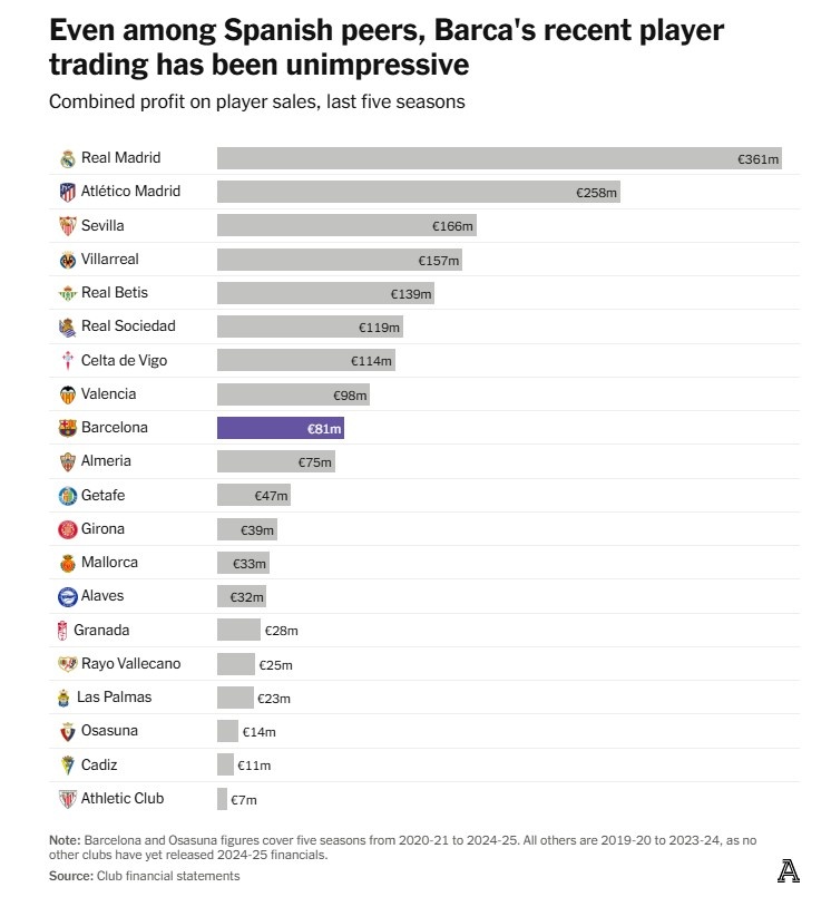 巴萨的商业收入已逐步恢复 增长仍在延续。巴萨将PSL收入计入商业项,但即便视其为一次性收益剔除,按德勤口径估算,其商业营收可能仍突破5亿欧元。 这得益于与全球品牌的大手笔合作。与耐克续约年入1.08亿欧元,2028年将涨至1.2亿。合同还包含1.58亿欧元签约奖金。诺坎普命名权及胸前广告赞助商Spotify年付5500万欧元。BLM业务贡献丰厚。 另一方面,尽管财务改善,球员销售收入反降,与巴托梅乌时代相反。天价出售内马尔本应引发理性引援,却开启灾难性支出循环,尽管卖人一度是健康收入来源。2017至2020年,巴萨录得3.769亿欧元球员交易利润,恰巧抵消同期4.323亿欧元运营亏损。 此后卖人收益缩水,即便23/24赛季通过出售登贝莱、凯西和尼科-冈萨雷斯获利8060万欧元。过去五赛季球员销售总利润仅8140万欧元,若非21/22赛季对球员价值计提1.6亿欧元减值,数字将更难看。此利润水平在西甲中游,远落后于两家马德里俱乐部及欧洲多家对手。