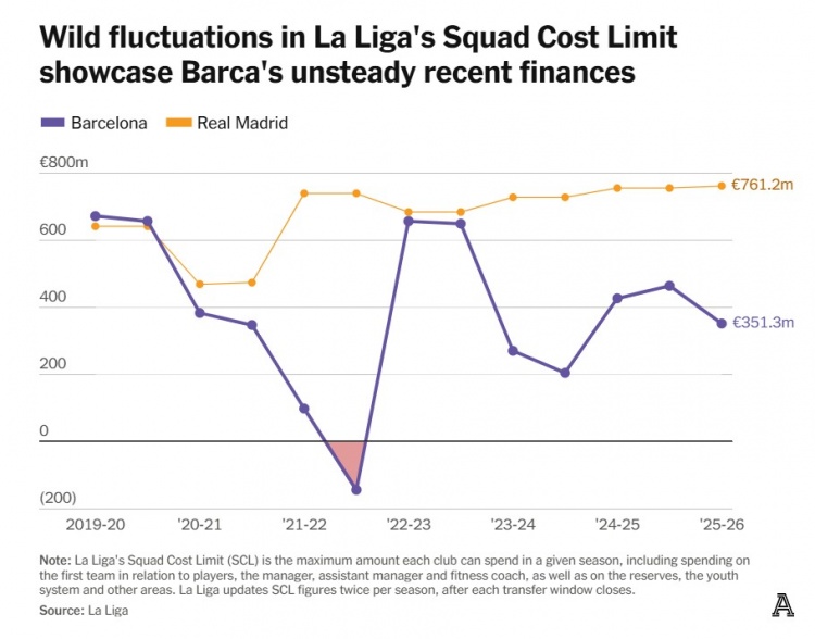 俱乐部财政崩溃,加之梅西于2020年8月提交离队申请,最终导致主席巴托梅乌在当年10月被迫下台前辞职。接任者是再度回归的拉波尔塔,他曾在2003至2010年担任巴萨主席。 拉波尔塔带着拯救巴萨财务的计划上任,并急于将大部分责任归咎于巴托梅乌为首的管理团队。 20/21赛季,巴萨录得5.554亿欧元税前亏损,创下足球俱乐部史上最惨淡财务纪录。 尽管拉波尔塔强调“前任管理层的严重失误”是“巴萨史上最糟糕财报”的根源,但这巨额亏损部分也是新管理层的主动选择。该赛季,巴萨对球员账面价值减值1.606亿欧元,并计提了8410万欧元与税务及法律诉讼相关的拨备。这些费用虽经俱乐部审计师认可,但也助拉波尔塔团队从21/22赛季起呈现更干净的账目。 在拉波尔塔第二个任期的首个完整赛季(21/22),俱乐部确实扭亏为盈,但存在重要前提。 这就引出了“杠杆”。 在2024年底向体育仲裁法庭的陈述中,巴萨表示,现任董事会当选后即认识到“变现部分(俱乐部)非体育资产是恢复净资产最有效且几乎是唯一途径”。他们称此举旨在“避免对会员造成直接影响,同时保持场上竞争力”。 巴萨不仅要缓解整体财务困境,还要应对西甲的压力——其阵容成本限制规则带来了无尽麻烦(见下图)。该规则旨在限制俱乐部超支,从预期收入中扣除非体育支出,剩余金额即为该赛季球队阵容支出上限。关键在于,SCL(Squad Cost Limit,阵容成本上限)是前瞻性的,通过提前限制球员注册来防止债务累积。 到2022年初,巴萨财务已如此糟糕,其SCL竟为负数(负1.444亿欧元)。这显然无法满足,实际意味着他们无法注册新球员,必须大幅增加收入或削减开支才能破局。