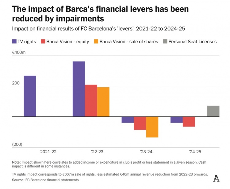 财务杠杆对巴萨的影响 巴萨工作室交易为底线贡献了4.01亿欧元,但此后大部分被逆转。23/24赛季,巴萨对两笔1亿欧元股权交易的应收款计提1.35亿欧元减值,实质上承认了款项无法收回。 巴萨工作室争议之大,致使前任审计师Grant Thornton对其23/24财报出具保留意见。这意味着什么?简言之,审计师不认可巴萨通过Bridgeburg对巴萨工作室股权的估值。鉴于股权出售款未能收回,Grant Thornton认为巴萨工作室(后更名为巴萨视觉)股权价值高估需减值;巴萨不同意,故审计师指出俱乐部账目估值存在重大错报。巴萨拒绝在23/24赛季确认减值,但在最新报表中重述当年数据时进行了计提。 新审计师已取代Grant Thornton。尽管巴萨接受了一年前坚决反对的减值看似奇怪,但需知西甲成本控制规则是前瞻性的。既然23/24赛季已成过去,回溯确认8610万欧元减值损失(导致当年税前亏损飙升至2.045亿欧元)的负面影响(至少在国内)已减小。 2021年主席竞选败给拉波尔塔、可能再度参选的维克托-丰特,近期指认延迟计提减值暴露了“缺乏透明度”,是董事会向会员隐瞒亏损的例证。 上赛季减值持续。在取消拆分巴萨媒体(整合俱乐部所有数字及视听业务,Bridgeburg及巴萨视觉隶属其下)上市计划后,后者与巴萨制作(原持有Bridgeburg股份的实体)合并。 这使俱乐部对巴萨制作的持股从100%降至53.4%,且合并后的协同管理意味着巴萨制作不再纳入巴萨集团报表合并范围。控制权丧失的价值重估,加上对巴萨制作整体价值的重新评估,导致巴萨24/25财年计提6500万欧元减值。22/23赛季确认的与巴萨视觉相关的4.011亿欧元收益中,已有2.862亿欧元被减值。 对上赛季损益表的这记重击被另一个杠杆抵消。 诺坎普翻修最终将新增9600个VIP坐席,以高价出售。今年1月,俱乐部完成了其中475个座位的“个人座位许可证(PSL)”销售,PSL有效期最长30年。 本质上,俱乐部未来三十年将这些座位的使用权售予买家,后者可自用或转售授权。巴萨放弃座位权以换取稳定收入。此轮已售的475个PSL为俱乐部创收1亿欧元。