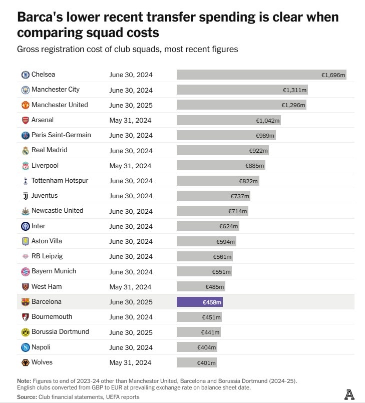 即使是西甲内部对比中,巴萨最近的球员交易也表现平平 拉波尔塔任内转会支出下降,至少自2022年夏窗引进拉菲尼亚、孔德和莱万后如此。过去两赛季净支出仅390万欧元。刚结束的夏窗净支出大致持平,尽管从曼联租借拉什福德涉及高额工资。 缩减支出已成常态,即便巴萨决策仍时有违背回归稳健的初衷。 去年夏窗达尼-奥尔莫的闹剧便是明证。 这位从莱比锡6000万欧元引进的新援,如同2022年三人组一样,签约后无法注册,最终因新队友克里斯滕森长期伤缺才获准上半赛季出场。随后一月,因西甲质疑俱乐部对VIP座位收入的确认,奥尔莫及新援保-维克托仅在相关部门介入后方完成注册。 尽管转会支出减少,巴萨截至6月底的8170万欧元净转会债务仍是西甲最高,反映联赛其他球队支出紧缩。他们仍欠拉菲尼亚4230万欧元、奥尔莫3370万欧元、孔德2500万欧元,以及罗克1720万欧元、费兰-托雷斯1380万欧元和莱万1130万欧元。本赛季需净支付1.002亿欧元转会分期款(未来赛季净应收1850万欧元),短期现金流进一步承压。