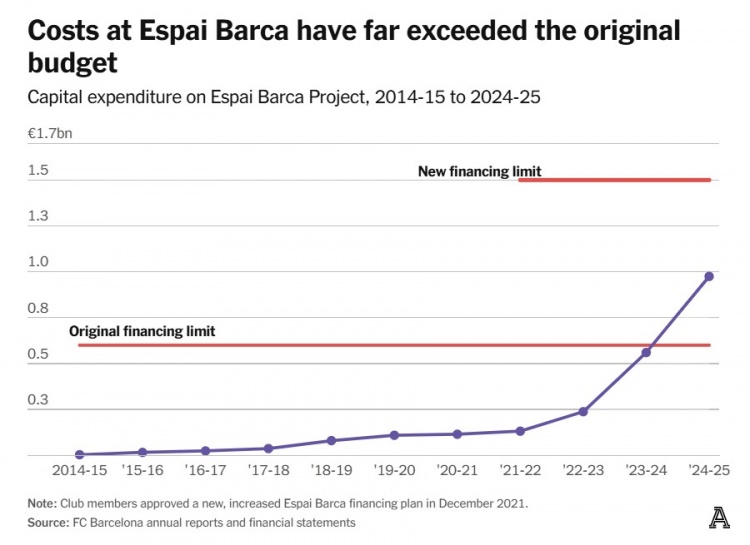 在这1亿欧元中,巴萨将7160万欧元确认为24/25赛季收入,剩余2840万欧元计入未来期间(账目未明确分摊依据)。 要理解为何巴萨与西甲SCL的缠斗仍在继续,试想若剔除全部PSL收入,上赛季税前业绩将是8000万欧元亏损。这也正是诺坎普重启如此关键的原因。 会否采取更多类似措施尚不确定。 2022年6月,拉波尔塔获会员批准可出售巴萨授权与商品子公司最多49.9%股权。此事至今未果,司库费兰-奥利弗上月明确表示BLM不会出售。 巴萨避免拉动此杠杆的意图显而易见。BLM上赛季营收突破1.5亿欧元。仅此商业子公司的收入,就超过了除皇马、马竞、塞维利亚和皇家社会外所有西甲俱乐部的最新总营收。 2014年4月初,巴萨会员进行了一次历史性投票。 超过2.7万名会员(占投票人数的72%)批准了“新诺坎普计划”,旨在升级扩建主场及周边区域。除改造足球场外,还将新建巴乌布劳格拉纳馆,供篮球队、手球队、曲棍球队及室内足球队使用。 全部工程原定于2017年5月至2021年3月四年内完成。项目预算6亿欧元,由三部分均摊:新诺坎普2亿欧元命名权收入、2亿欧元正向运营现金流及2亿欧元银行贷款。然而,近十二年后,项目仍在进行,成本早已失控。 原定6亿欧元预算在2021年拉波尔塔回任主席时被弃,当时工程几无进展,更别提如期竣工。仅能容纳6000人的克鲁伊夫球场(女足、B队及U19主场)已建成。 同年末,会员就项目融资再次投票,以较2014年更高的支持率通过了拉波尔塔的新方案。 新批准的预算上限高达15亿欧元,是原预算的1.5倍。诺坎普工程费用飙升至9亿欧元,远超原定的4.2亿。新巴乌布劳格拉纳馆及周边设施成本从9000万欧元涨至4.2亿。甚至区域规划拨款也从2000万欧元增至1亿欧元,幅度惊人。 四年过去,修订方案再度延期,资金持续流出:22/23赛季投入1.06亿欧元,次年增至3.22亿欧元,上赛季再投4.15亿欧元。截至2025年6月,项目资本支出已达9.75亿欧元(见下图)。后续投入仍将巨大。
