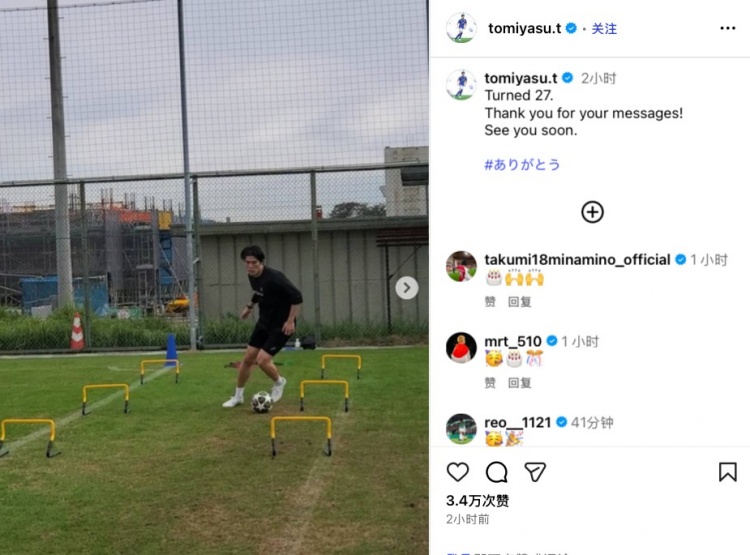 足球比分网11月5日讯 今天是日本国脚富安健洋27岁生日。球员今日更新社媒,晒出自己在进行恢复训练的照片,纪念27岁生日。 富安健洋写道:“27岁了。感谢各位的祝福!我们很快就会再见。” 今年7月他在与枪手还有一年合同的情况下选择提前解约,目前他仍在进行康复,德转身价为1800万欧。他的前东家阿森纳今日也在社媒为他送上生日祝福。 |