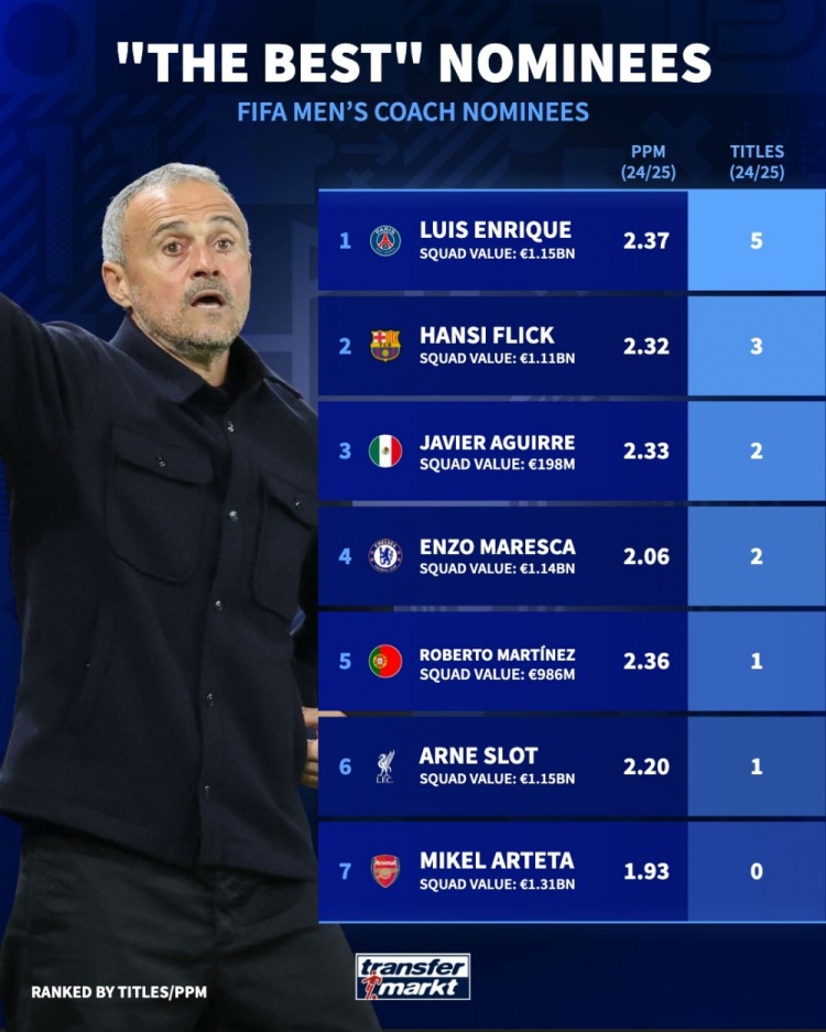 足球比分网11月7日讯 FIFA公布年度最佳男足教练候选名单,德国转会市场列出了入围者上赛季的成绩。 德转列最佳教练候选上赛季成绩: 恩里克(巴黎圣日耳曼) 球队身价——11.5亿欧 场均积分——2.37 冠军——法甲、法国杯、法国超级杯、欧冠、欧超杯 弗里克(巴萨) 球队身价——11.1亿欧 场均积分——2.32 冠军——西甲、国王杯、西超杯 阿吉雷(墨西哥) 球队身价——1.98亿欧 场均积分——2.33 冠军——金杯赛、北美及加勒比海国家联赛 马雷斯卡(切尔西) 球队身价——11.4亿欧 场均积分——2.06 冠军——欧协联、世俱杯 罗伯特-马丁内斯(葡萄牙) 球队身价——9.86亿欧 场均积分——2.36 冠军——欧国联 斯洛特(利物浦) 球队身价——11.5亿欧 场均积分——2.20 冠军——英超 阿尔特塔(阿森纳) 球队身价——13.1亿欧 场均积分——1.93 冠军——无 |