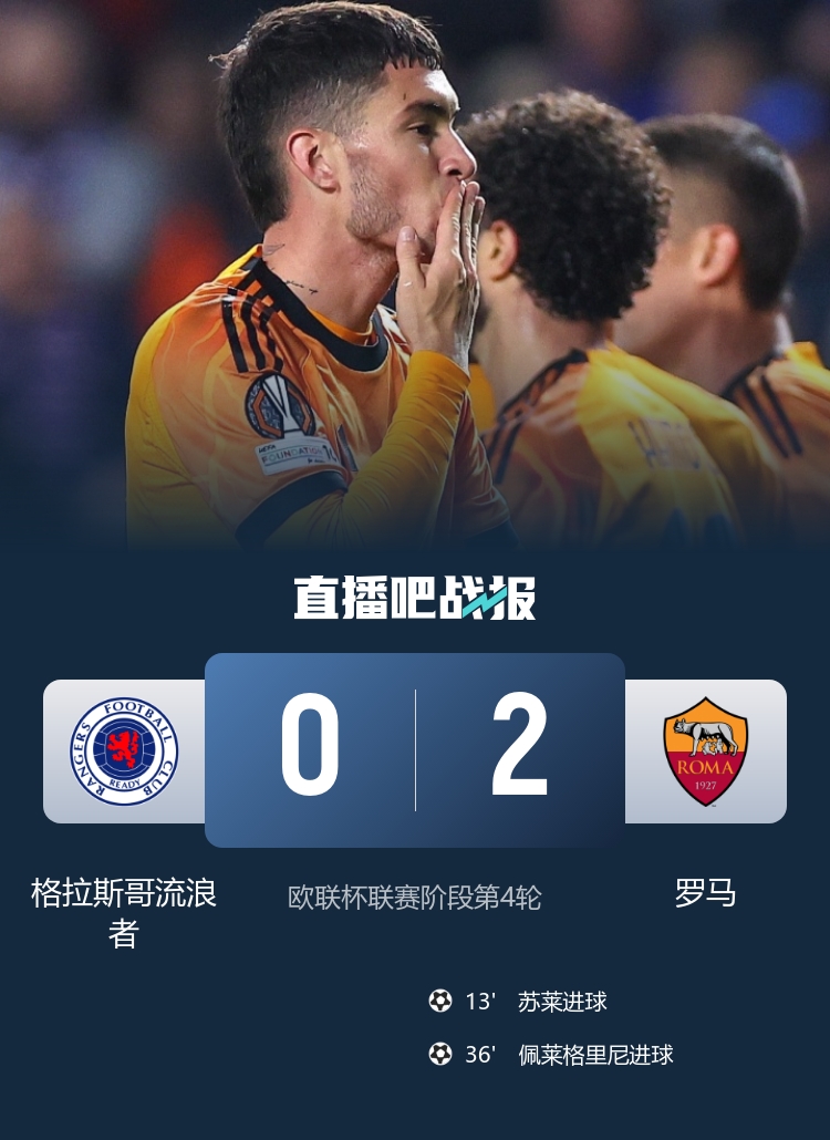苏莱、佩莱格里尼破门,切利克中框失空门。罗马终止欧战两连败4轮6分,流浪者0分垫底。 【其他新闻】 阿根廷大名单:梅西领衔,小蜘蛛、劳塔罗、恩佐在列,大马丁缺阵
