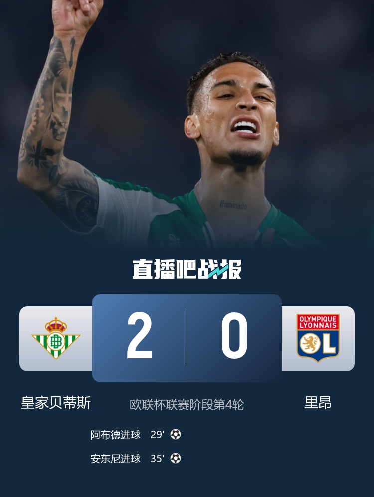 【比赛战报】 欧联4场不败!贝蒂斯2-0里昂 安东尼精彩挑射破门+近10场6球2助