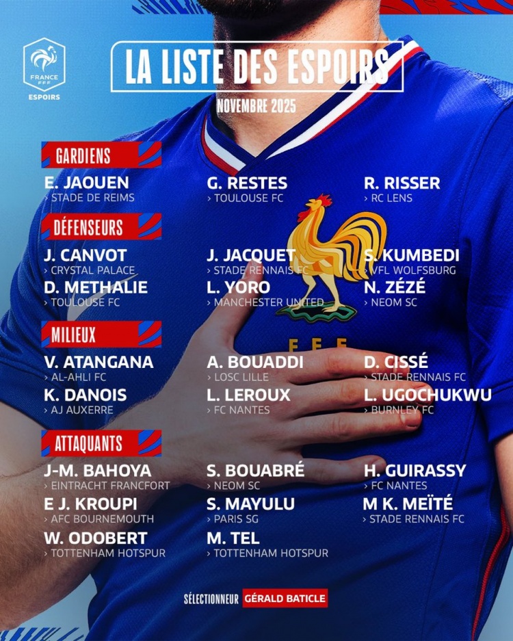 足球比分网11月6日讯 法国U21最新一期名单公布,特尔、约罗、乌戈丘库、奥多贝尔、马尤卢等球员入选。 法国U21本月将参加2027年U21欧洲杯预选赛,先后对阵瑞士U21、法罗群岛U21。 法国U21名单: 门将:贾万(兰斯)、雷斯特斯(图卢兹)、雷瑟(朗斯) 后卫:坎沃(水晶宫)、雅奎特(雷恩)、昆贝迪(沃尔夫斯堡)、梅塔利(图卢兹)、约罗(曼联)、泽泽(新未来城体育) 中场:阿坦加纳(吉达国民)、布阿迪(里尔)、德贾伊-西塞(雷恩)、达努瓦(欧塞尔)、勒鲁(南特)、乌戈丘库(伯恩利) 前锋:巴霍亚(法兰克福)、阿布雷(新未来城体育)、巴赫雷巴-吉拉西(南特)、克鲁皮(伯恩茅斯)、马尤卢(巴黎)、梅特(雷恩)、奥多贝尔(热刺)、特尔(热刺)