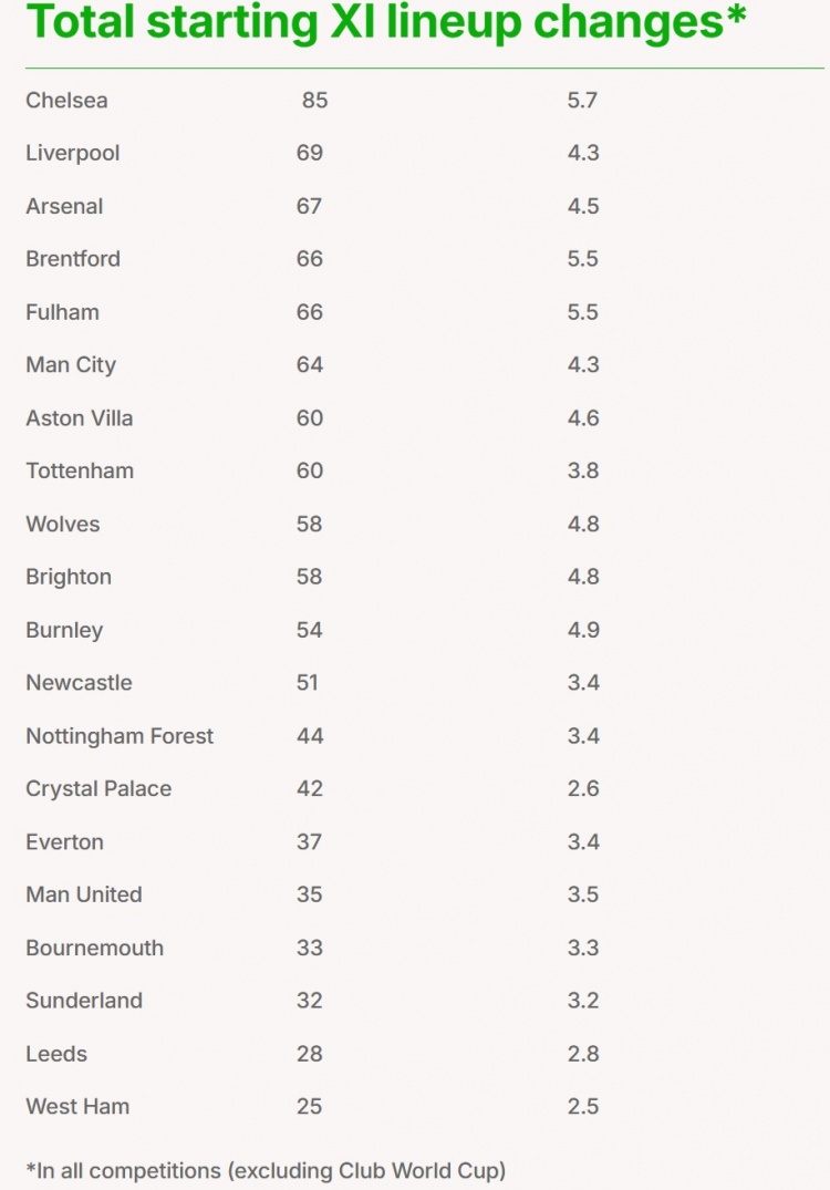 足球比分网11月6日讯 英媒每日邮报统计本赛季英超各队首发阵容调整次数,切尔西以85次居首,利物浦,阿森纳分列二三位。 本赛季英超各队首发阵容调整次数(统计范围为不包含世俱杯在内的各项赛事): 1、切尔西:85次 2、利物浦:69次 3、阿森纳:67次 4、布伦特福德:66次 富勒姆:66次 6、曼城:64次 7、阿斯顿维拉:60次 热刺:60次 9、狼队:58次 布莱顿:58次 11、伯恩利:54次 12、纽卡:51次 13、诺丁汉森林:44次 14、水晶宫:42次 15、埃弗顿:37次 16、曼联:35次 17、伯恩茅斯:33次 18、桑德兰:32次 19、利兹联:28次 20:西汉姆:25次